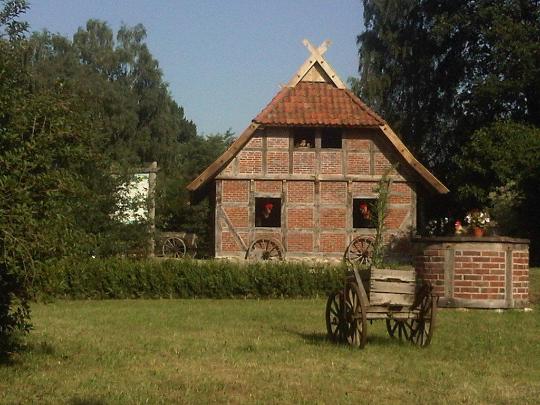 Als der Neubau auf dem Nachbargrundstück Gestalt annahm, bemerkte man, dass die alte Scheune für dessen Zuwegung im Wege stand. Somit gab es für den Rückbau der Scheune das gut erhaltene Eichenfachwerk, aus dem nun der Restaurator und Zimmerermeister Reiner Helms diese Remise hier originalgetreu und nach alter Zimmerer- und Handwerkskunst hat erstehen lassen. Alle Verbindungen sind traditionell gezimmerte Holzverbindungen, es wurden keinerlei Schrauben oder Eisennägel für das Grundgerüst verwendet.