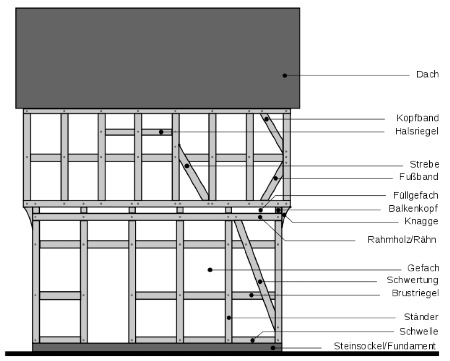 Schmematischer Aufbau eines Fachwerkhauses Das Rähm ist der obere waagerechte Abschluss der Fachwerkwand bzw. der Holzrahmenkonstruktion. Das Rähm hat die Aufgabe, den Längsverband in der Konstruktion herzustellen, die horizontalen Schubkräfte über die Streben und die vertikalen Kräfte über die Stiele/Ständer in die Schwellen bzw. in das Fundament abzuleiten. Ferner ist das Rähm das Auflager für Balkenlagen oder Sparren. Aufschieblinge auf Deckenbalken und Sparren verlängern den Dachvorsprung und geben dem Dach im Traufbereich eine geschwungene, flachere Dachneigung, um das von der Dachfläche strömende Regenwasser oder abrutschenden Schnee leichter in die Dachrinne ableiten zu können.
